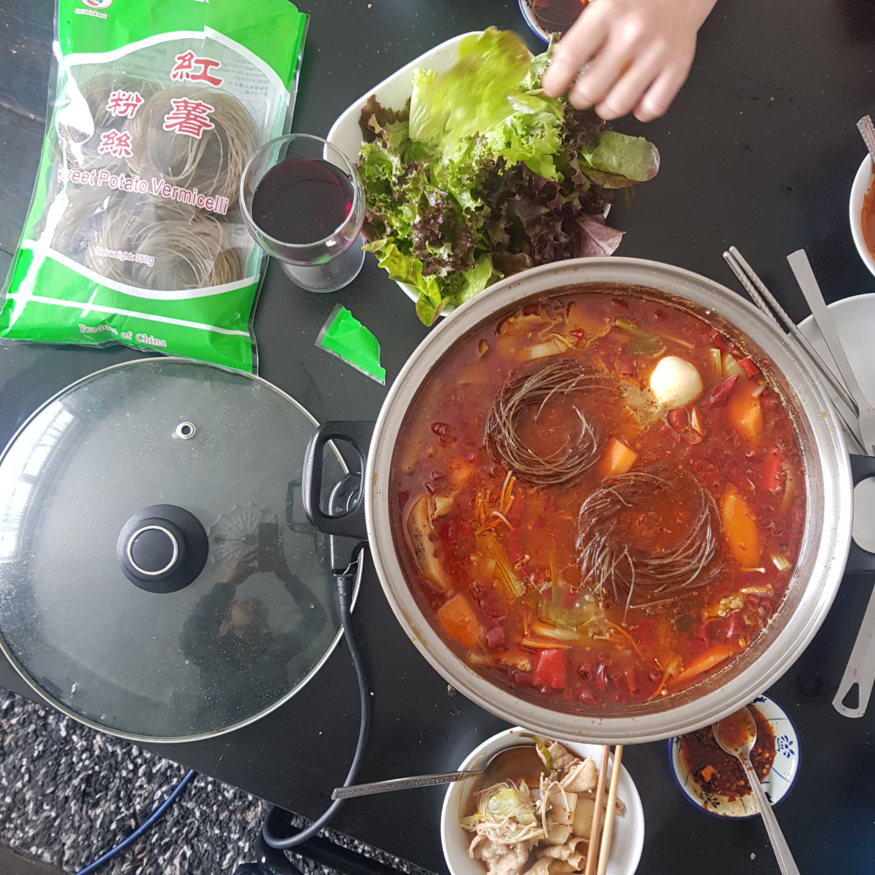 午餐時間,今天吃火鍋咯! 買了小肥羊的辣湯。。。沒辣,自己再挖了很多很多的辣椒丟進去。