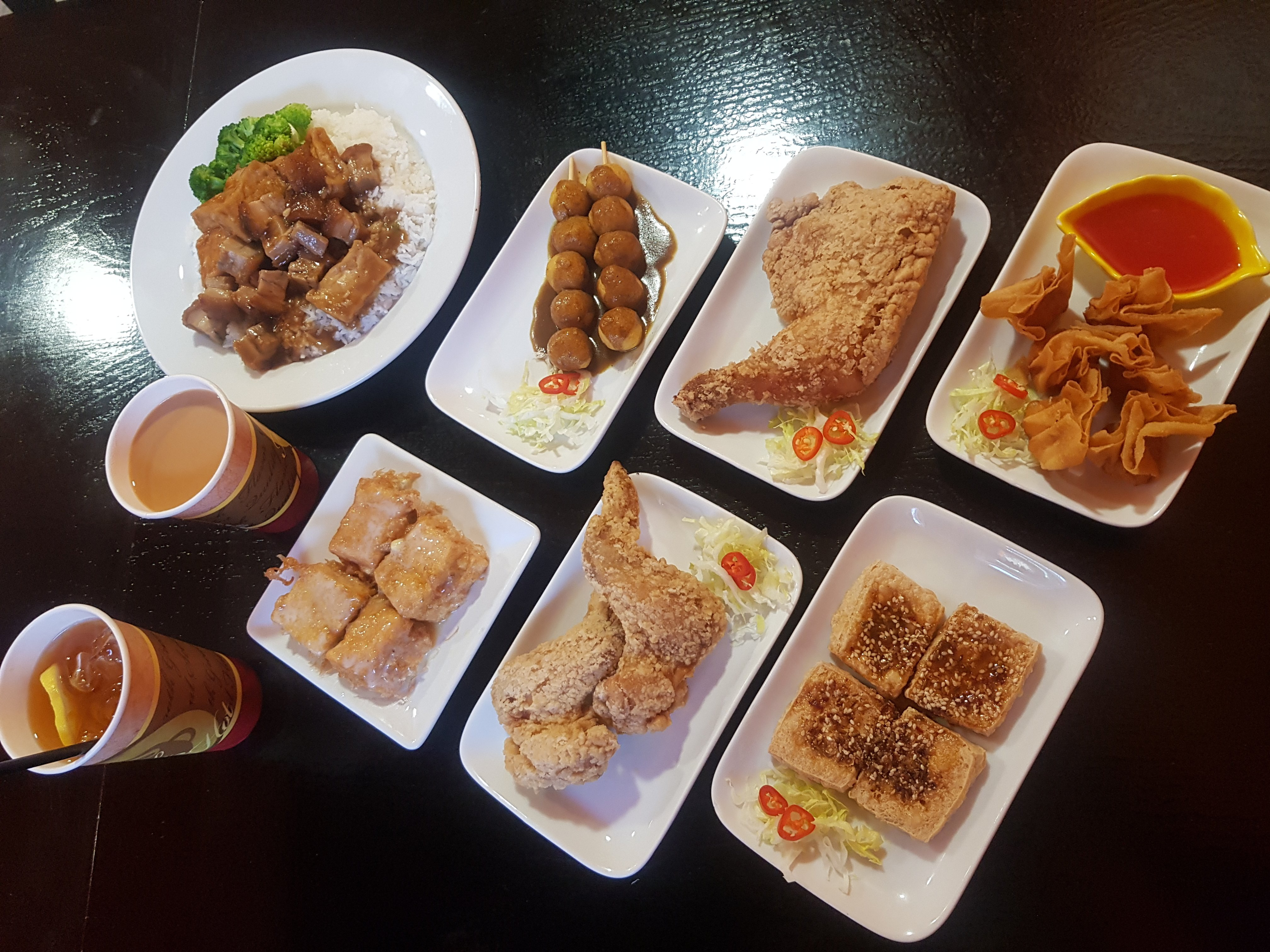 食物左上到右:豆腐火腩飯,魚蛋,生炸戰斧,炸蝦雲吞
