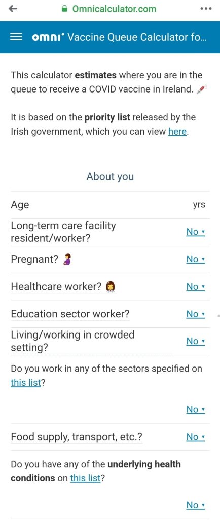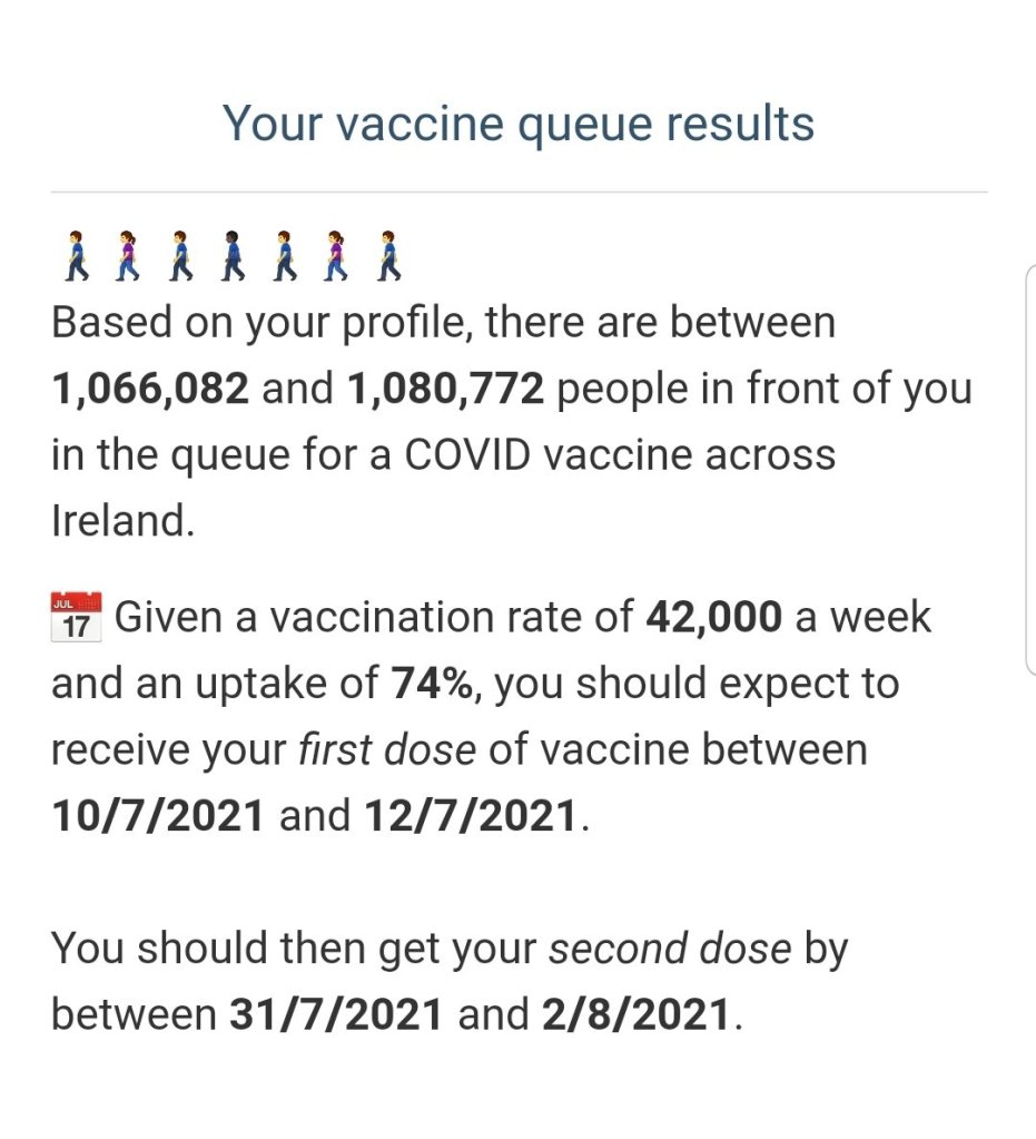 想知道你是第幾位注射疫苗,可以按這裡: Vaccine Queue Calculator for Ireland