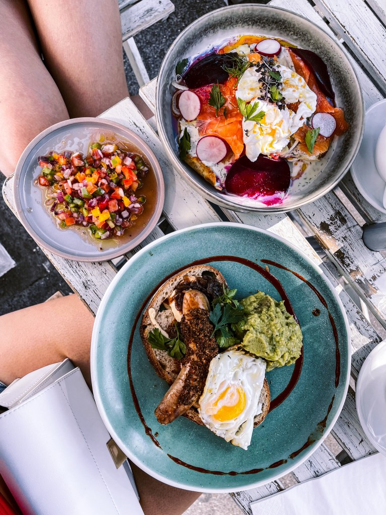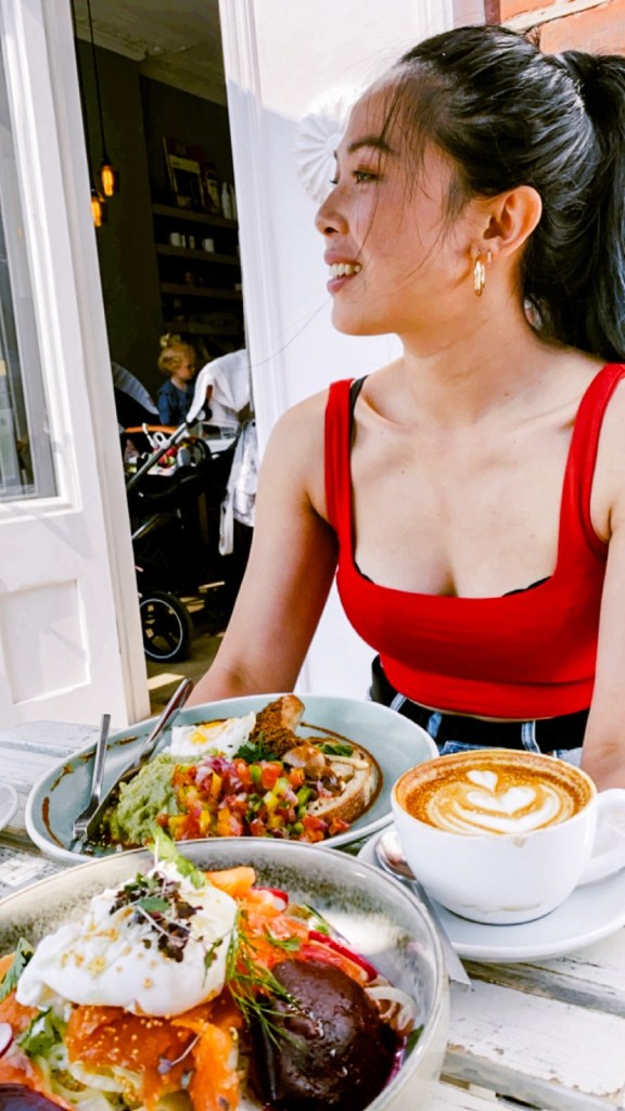 本來是沒有打算寫,所有就照片不多,你們就將就一下吧。這家店面不大,室內用餐的話,大概就5-9張桌子。我們當天去時天氣非常的熱,就坐了外面。兩人就點了兩道菜,真的是啊,他們的咖啡和食物都很好打卡,真的很漂亮。