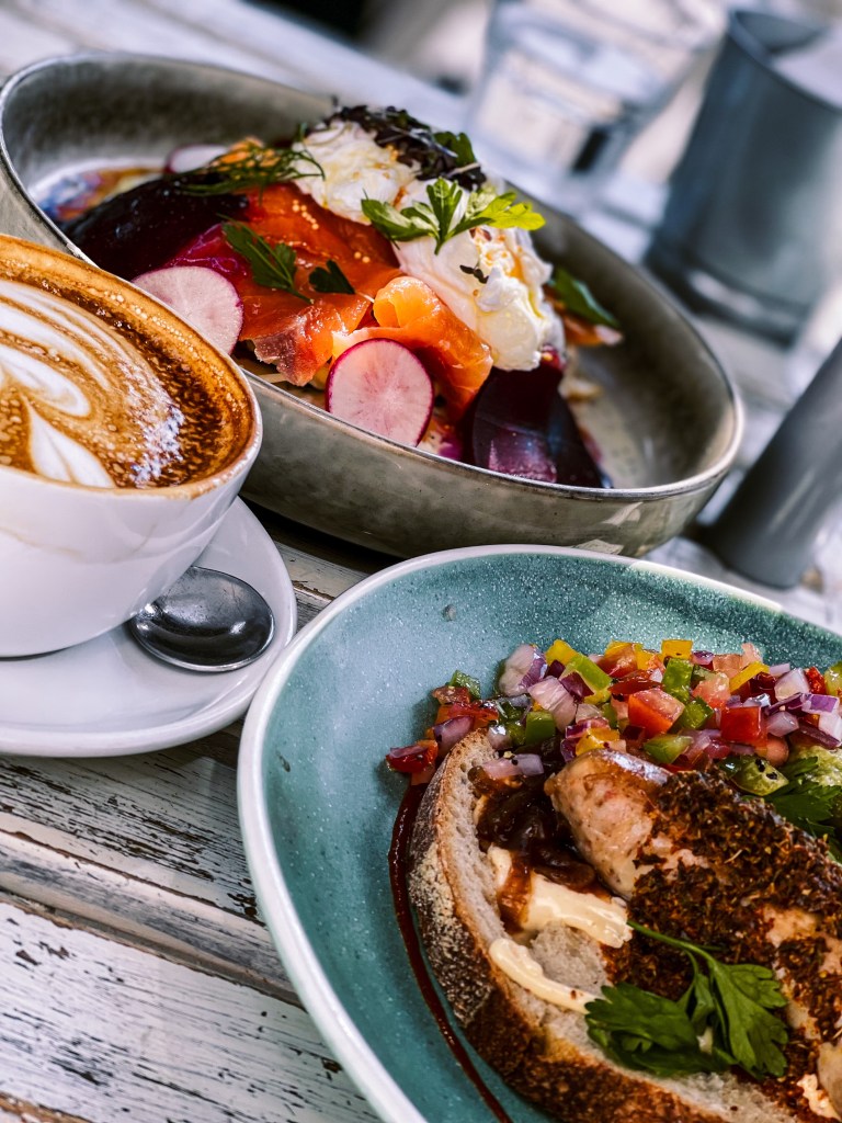 先來分享一下 Smokey West Corkey Pancakes €13.90 。酪醬(buttermilk)鬆餅,山羊奶酪,烟熏三文鱼,水波蛋,茴香,蘿蔔,醃紅菜頭,芥菜种,莳萝。(媽的,好多材料要找翻譯)。 單單看裡面有什麼你就知道是大雜燴了。如果你喜歡吃 煙熏三文魚,你一定要點這道。我點也只是因為想吃咸的pancake。偏偏我不喜歡煙熏三文魚,幸好當天是和朋友混着吃。送到面前時第一反應是『我的pancake勒?』,結果都藏在下面,超級的多。價格看起來好像有點貴,可是吃完會飽到吐。