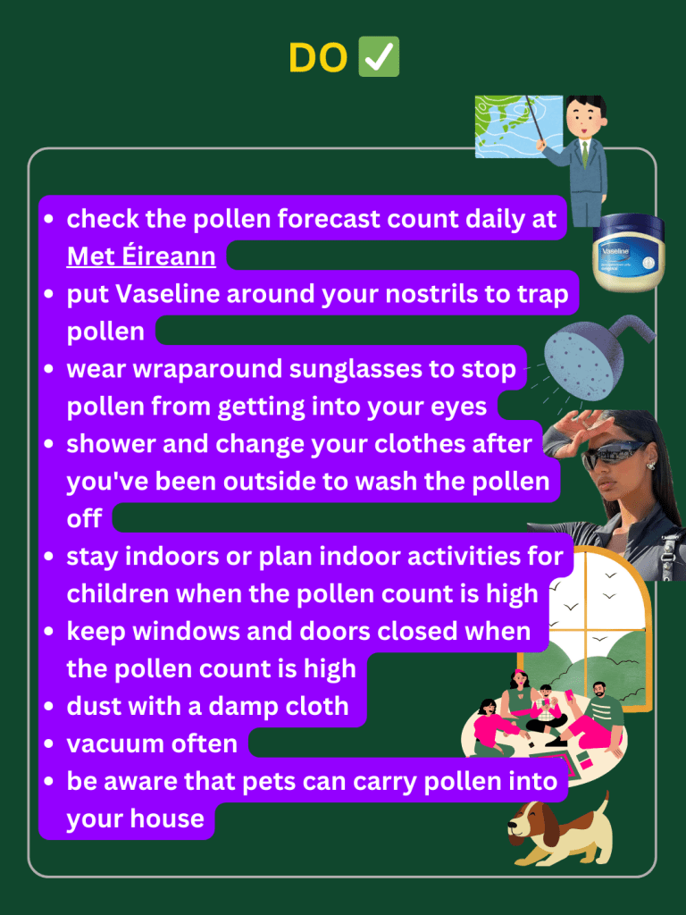 Grass Pollen: Grass pollen season kicks off in May and lasts through July. This marks the peak of the pollen season in Ireland, as grasses, including common lawn species from the Poaceae family, release vast amounts of pollen.